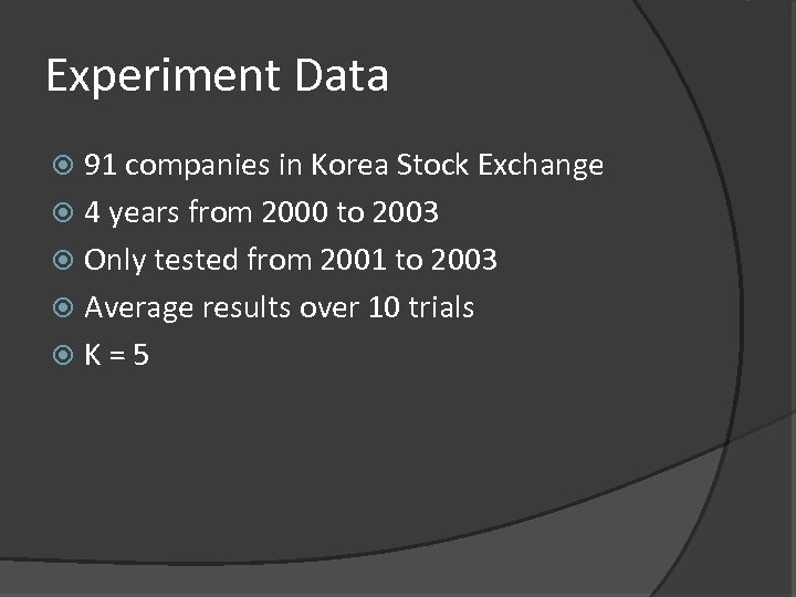 Experiment Data 91 companies in Korea Stock Exchange 4 years from 2000 to 2003 Only tested from 2001 to 2003 Average results over 10 trials K=5