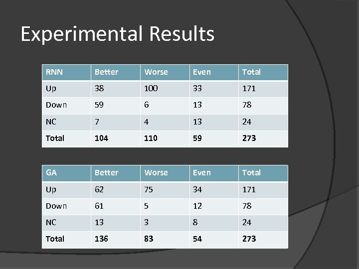 Experimental Results RNN Better Worse Even Total Up 38 100 33 171 Down 59 6 13 78 NC 7 4 13 24 Total 104 110 59 273 GA Better Worse Even Total Up 62 75 34 171 Down 61 5 12 78 NC 13 3 8 24 Total 136 83 54 273