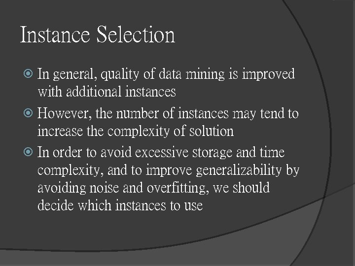 Instance Selection In general, quality of data mining is improved with additional instances However, the number of instances may tend to increase the complexity of solution In order to avoid excessive storage and time complexity, and to improve generalizability by avoiding noise and overfitting, we should decide which instances to use