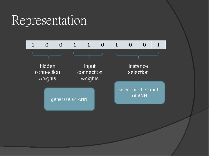 Representation 1 0 0 hidden connection weights 1 1 0 input connection weights generate an ANN 1 0 0 1 instance selection the inputs of ANN