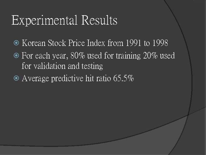 Experimental Results Korean Stock Price Index from 1991 to 1998 For each year, 80% used for training 20% used for validation and testing Average predictive hit ratio 65. 5%