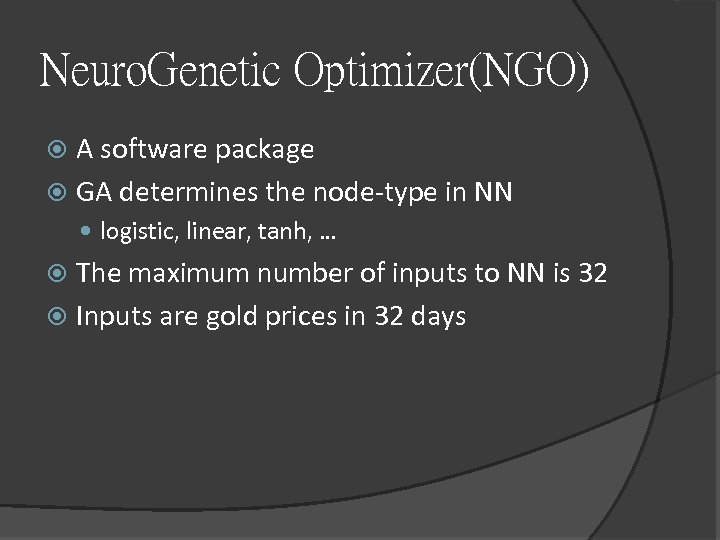 Neuro. Genetic Optimizer(NGO) A software package GA determines the node-type in NN logistic, linear, tanh, … The maximum number of inputs to NN is 32 Inputs are gold prices in 32 days