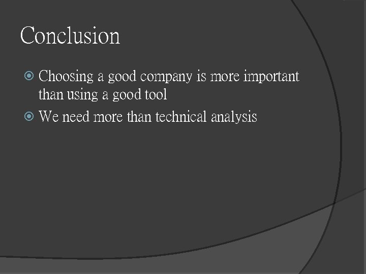 Conclusion Choosing a good company is more important than using a good tool We need more than technical analysis