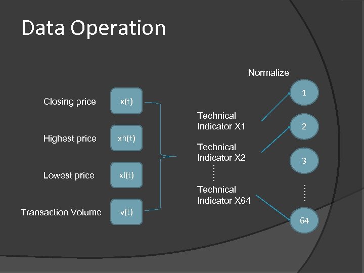 Data Operation Normalize Closing price 1 x(t) Highest price Lowest price xh(t) xl(t) 2 Technical Indicator X 2 3 …… Technical Indicator X 1 Transaction Volume v(t) …… Technical Indicator X 64 64