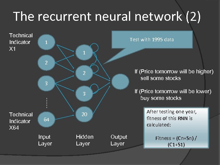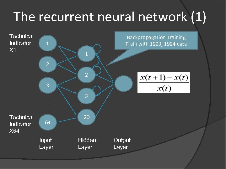 The recurrent neural network (1) Technical Indicator X 1 Backpropagation Training Train with 1993, 1994 data 1 1 2 2 3 3 …… Technical Indicator X 64 64 Input Layer 20 Hidden Layer Output Layer