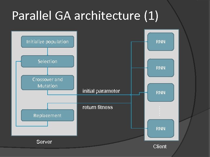 Parallel GA architecture (1) Initialize population RNN Selection RNN Crossover and Mutation initial parameter Replacement …… return fitness RNN Server Client