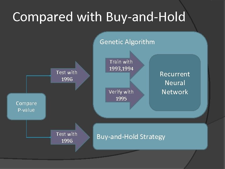 Compared with Buy-and-Hold Genetic Algorithm Test with 1996 Train with 1993, 1994 Verify with 1995 Compare P-value Test with 1996 Recurrent Neural Network Buy-and-Hold Strategy
