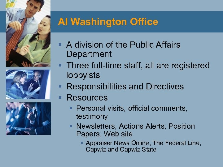 AI Washington Office § A division of the Public Affairs Department § Three full-time staff, all are registered lobbyists § Responsibilities and Directives § Resources § Personal visits, official comments, testimony § Newsletters, Actions Alerts, Position Papers, Web site § Appraiser News Online, The Federal Line, Capwiz and Capwiz State