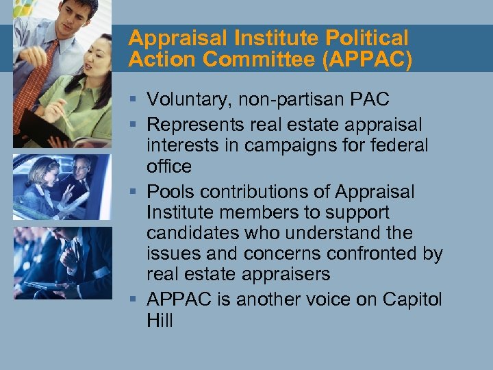 Appraisal Institute Political Action Committee (APPAC) § Voluntary, non-partisan PAC § Represents real estate appraisal interests in campaigns for federal office § Pools contributions of Appraisal Institute members to support candidates who understand the issues and concerns confronted by real estate appraisers § APPAC is another voice on Capitol Hill