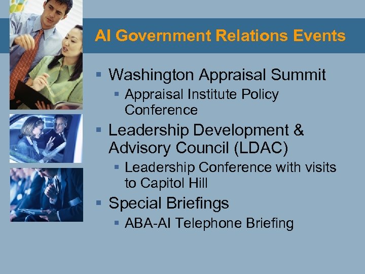 AI Government Relations Events § Washington Appraisal Summit § Appraisal Institute Policy Conference § Leadership Development & Advisory Council (LDAC) § Leadership Conference with visits to Capitol Hill § Special Briefings § ABA-AI Telephone Briefing