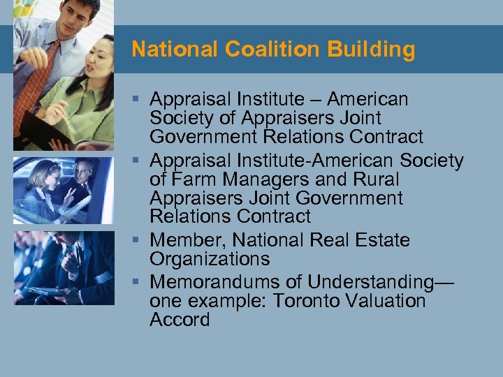 National Coalition Building § Appraisal Institute – American Society of Appraisers Joint Government Relations Contract § Appraisal Institute-American Society of Farm Managers and Rural Appraisers Joint Government Relations Contract § Member, National Real Estate Organizations § Memorandums of Understanding— one example: Toronto Valuation Accord