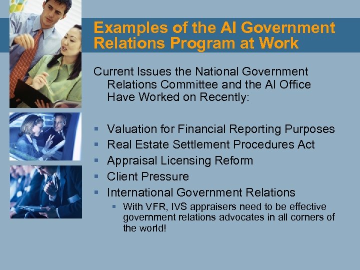 Examples of the AI Government Relations Program at Work Current Issues the National Government Relations Committee and the AI Office Have Worked on Recently: § § § Valuation for Financial Reporting Purposes Real Estate Settlement Procedures Act Appraisal Licensing Reform Client Pressure International Government Relations § With VFR, IVS appraisers need to be effective government relations advocates in all corners of the world!