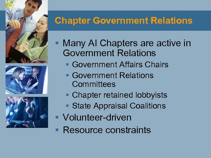 Chapter Government Relations § Many AI Chapters are active in Government Relations § Government Affairs Chairs § Government Relations Committees § Chapter retained lobbyists § State Appraisal Coalitions § Volunteer-driven § Resource constraints