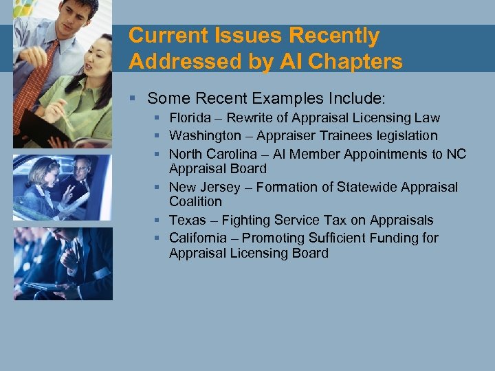 Current Issues Recently Addressed by AI Chapters § Some Recent Examples Include: § Florida – Rewrite of Appraisal Licensing Law § Washington – Appraiser Trainees legislation § North Carolina – AI Member Appointments to NC Appraisal Board § New Jersey – Formation of Statewide Appraisal Coalition § Texas – Fighting Service Tax on Appraisals § California – Promoting Sufficient Funding for Appraisal Licensing Board