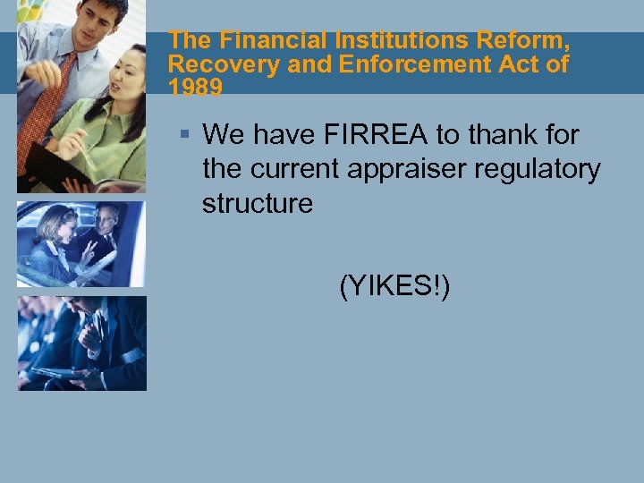 The Financial Institutions Reform, Recovery and Enforcement Act of 1989 § We have FIRREA to thank for the current appraiser regulatory structure (YIKES!)