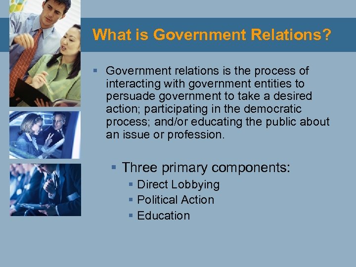 What is Government Relations? § Government relations is the process of interacting with government entities to persuade government to take a desired action; participating in the democratic process; and/or educating the public about an issue or profession. § Three primary components: § Direct Lobbying § Political Action § Education