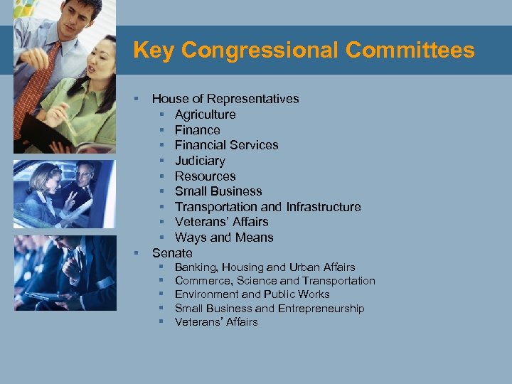 Key Congressional Committees § § House of Representatives § Agriculture § Financial Services § Judiciary § Resources § Small Business § Transportation and Infrastructure § Veterans’ Affairs § Ways and Means Senate § § § Banking, Housing and Urban Affairs Commerce, Science and Transportation Environment and Public Works Small Business and Entrepreneurship Veterans’ Affairs