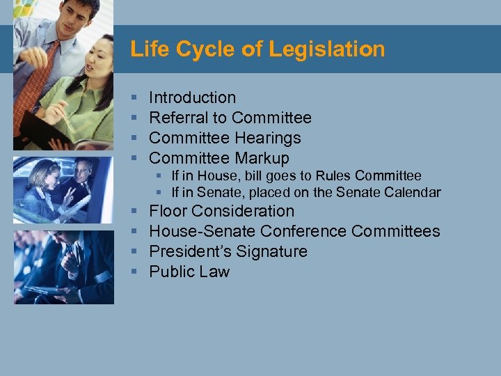 Life Cycle of Legislation § § Introduction Referral to Committee Hearings Committee Markup § If in House, bill goes to Rules Committee § If in Senate, placed on the Senate Calendar § § Floor Consideration House-Senate Conference Committees President’s Signature Public Law