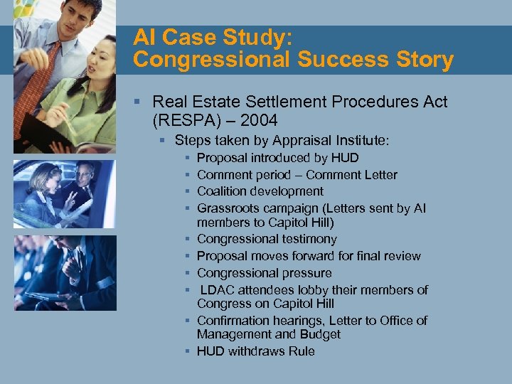 AI Case Study: Congressional Success Story § Real Estate Settlement Procedures Act (RESPA) – 2004 § Steps taken by Appraisal Institute: § § § § § Proposal introduced by HUD Comment period – Comment Letter Coalition development Grassroots campaign (Letters sent by AI members to Capitol Hill) Congressional testimony Proposal moves forward for final review Congressional pressure LDAC attendees lobby their members of Congress on Capitol Hill Confirmation hearings, Letter to Office of Management and Budget HUD withdraws Rule