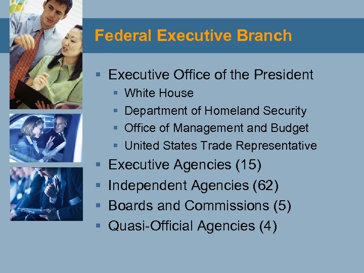 Federal Executive Branch § Executive Office of the President § § § § White House Department of Homeland Security Office of Management and Budget United States Trade Representative Executive Agencies (15) Independent Agencies (62) Boards and Commissions (5) Quasi-Official Agencies (4)