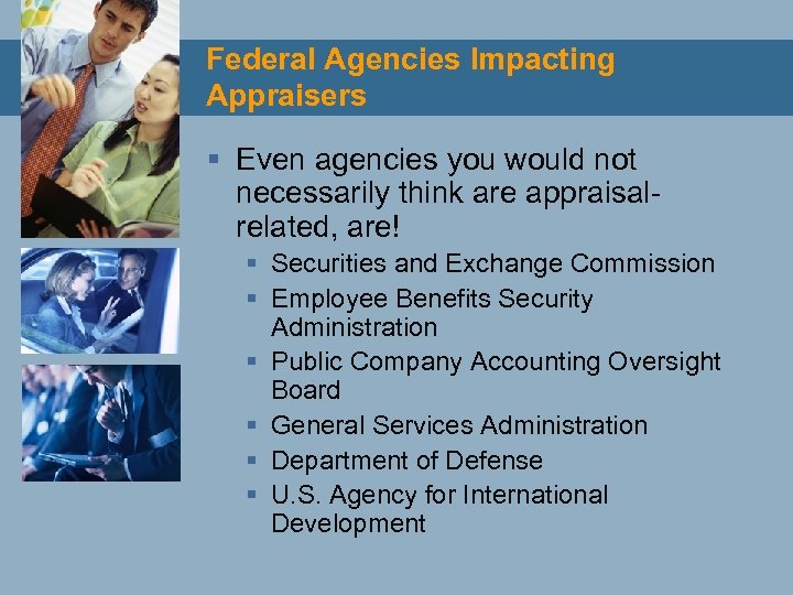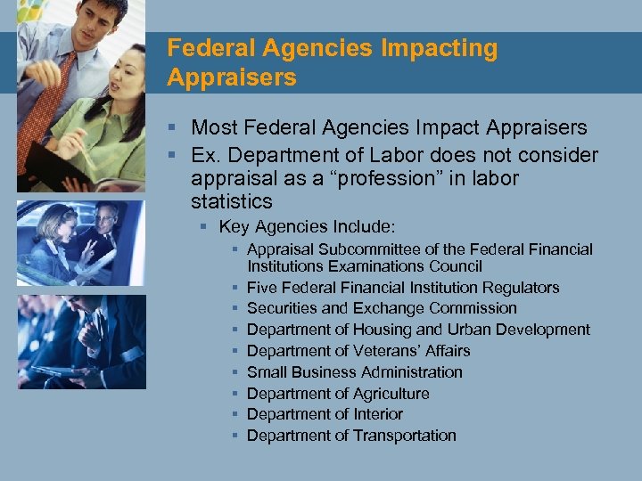 Federal Agencies Impacting Appraisers § Most Federal Agencies Impact Appraisers § Ex. Department of Labor does not consider appraisal as a “profession” in labor statistics § Key Agencies Include: § Appraisal Subcommittee of the Federal Financial Institutions Examinations Council § Five Federal Financial Institution Regulators § Securities and Exchange Commission § Department of Housing and Urban Development § Department of Veterans’ Affairs § Small Business Administration § Department of Agriculture § Department of Interior § Department of Transportation