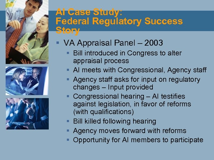 AI Case Study: Federal Regulatory Success Story § VA Appraisal Panel – 2003 § Bill introduced in Congress to alter appraisal process § AI meets with Congressional, Agency staff § Agency staff asks for input on regulatory changes – Input provided § Congressional hearing – AI testifies against legislation, in favor of reforms (with qualifications) § Bill killed following hearing § Agency moves forward with reforms § Opportunity for AI members to participate