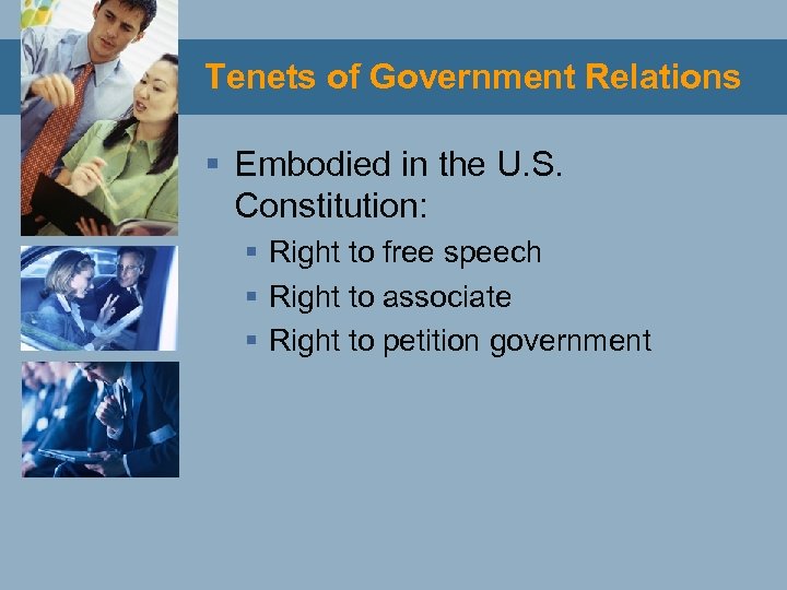 Tenets of Government Relations § Embodied in the U. S. Constitution: § Right to free speech § Right to associate § Right to petition government