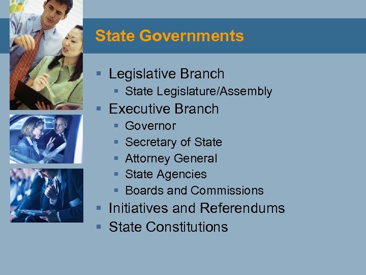 State Governments § Legislative Branch § State Legislature/Assembly § Executive Branch § § § Governor Secretary of State Attorney General State Agencies Boards and Commissions § Initiatives and Referendums § State Constitutions