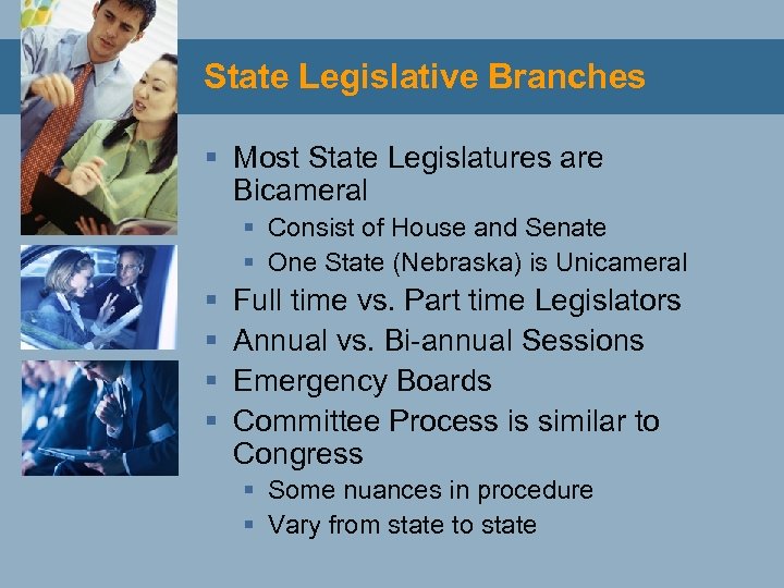 State Legislative Branches § Most State Legislatures are Bicameral § Consist of House and Senate § One State (Nebraska) is Unicameral § § Full time vs. Part time Legislators Annual vs. Bi-annual Sessions Emergency Boards Committee Process is similar to Congress § Some nuances in procedure § Vary from state to state