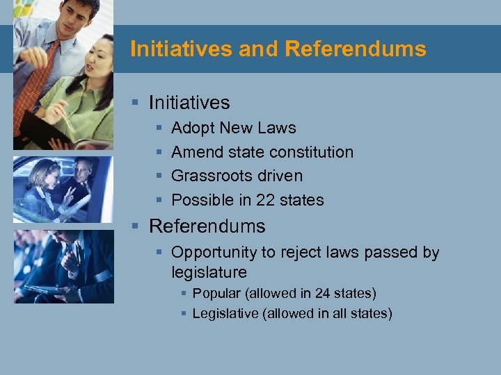 Initiatives and Referendums § Initiatives § § Adopt New Laws Amend state constitution Grassroots driven Possible in 22 states § Referendums § Opportunity to reject laws passed by legislature § Popular (allowed in 24 states) § Legislative (allowed in all states)