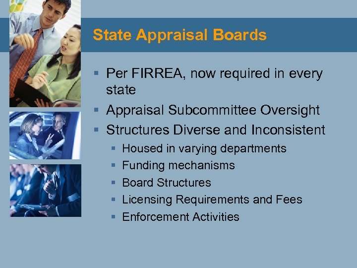 State Appraisal Boards § Per FIRREA, now required in every state § Appraisal Subcommittee Oversight § Structures Diverse and Inconsistent § § § Housed in varying departments Funding mechanisms Board Structures Licensing Requirements and Fees Enforcement Activities