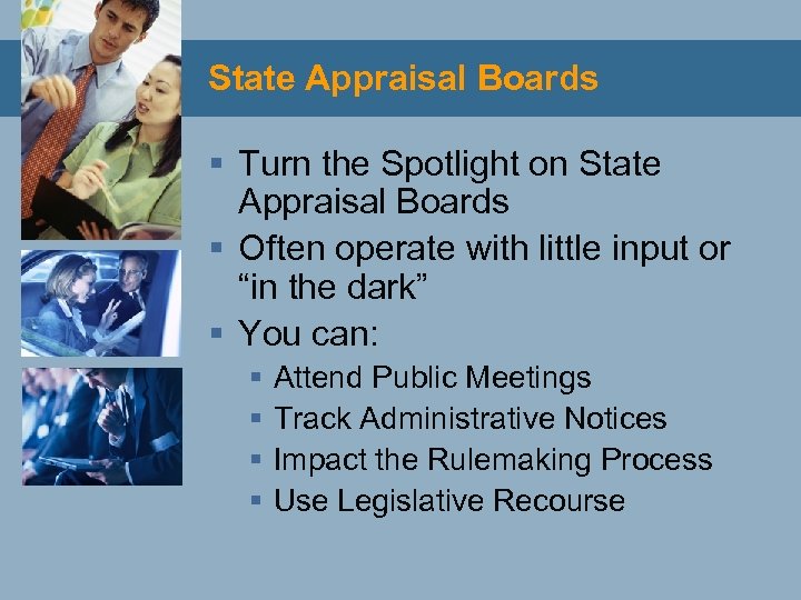State Appraisal Boards § Turn the Spotlight on State Appraisal Boards § Often operate with little input or “in the dark” § You can: § § Attend Public Meetings Track Administrative Notices Impact the Rulemaking Process Use Legislative Recourse