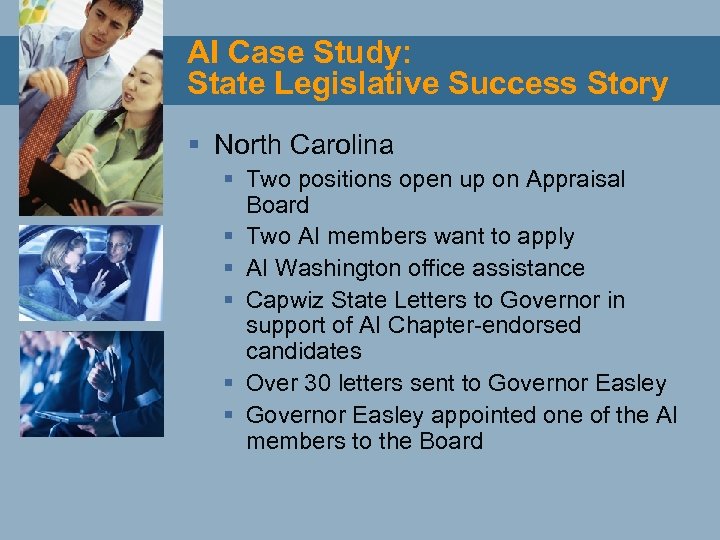 AI Case Study: State Legislative Success Story § North Carolina § Two positions open up on Appraisal Board § Two AI members want to apply § AI Washington office assistance § Capwiz State Letters to Governor in support of AI Chapter-endorsed candidates § Over 30 letters sent to Governor Easley § Governor Easley appointed one of the AI members to the Board