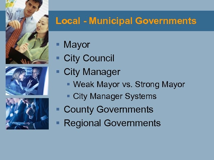 Local - Municipal Governments § Mayor § City Council § City Manager § Weak Mayor vs. Strong Mayor § City Manager Systems § County Governments § Regional Governments