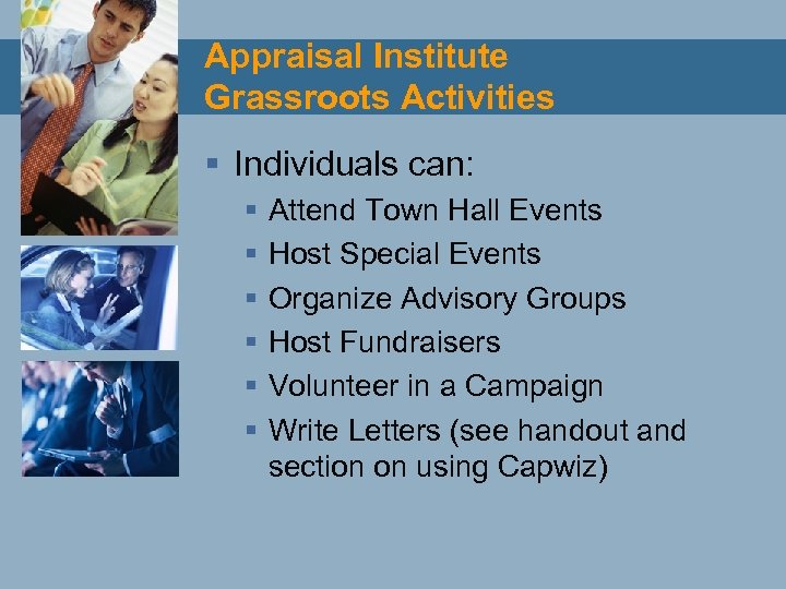 Appraisal Institute Grassroots Activities § Individuals can: § § § Attend Town Hall Events Host Special Events Organize Advisory Groups Host Fundraisers Volunteer in a Campaign Write Letters (see handout and section on using Capwiz)