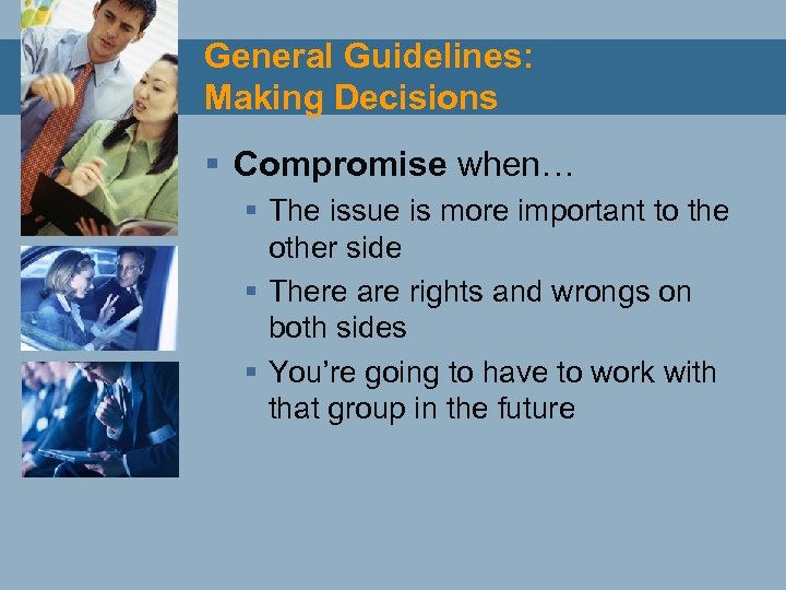 General Guidelines: Making Decisions § Compromise when… § The issue is more important to the other side § There are rights and wrongs on both sides § You’re going to have to work with that group in the future