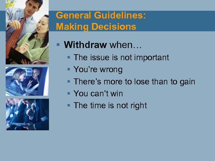 General Guidelines: Making Decisions § Withdraw when… § § § The issue is not important You’re wrong There’s more to lose than to gain You can’t win The time is not right