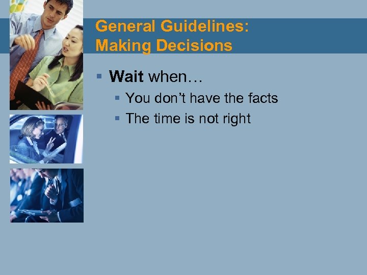 General Guidelines: Making Decisions § Wait when… § You don’t have the facts § The time is not right
