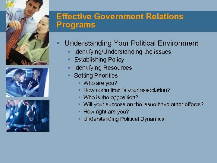 Effective Government Relations Programs § Understanding Your Political Environment § § Identifying/Understanding the issues Establishing Policy Identifying Resources Setting Priorities § § § Who are you? How committed is your association? Who is the opposition? Will your success on the issue have other effects? How right are you? Understanding Political Dynamics