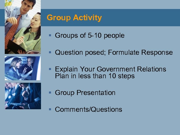 Group Activity § Groups of 5 -10 people § Question posed; Formulate Response § Explain Your Government Relations Plan in less than 10 steps § Group Presentation § Comments/Questions