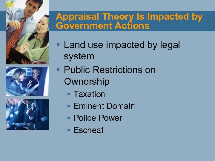 Appraisal Theory Is Impacted by Government Actions § Land use impacted by legal system § Public Restrictions on Ownership § § Taxation Eminent Domain Police Power Escheat