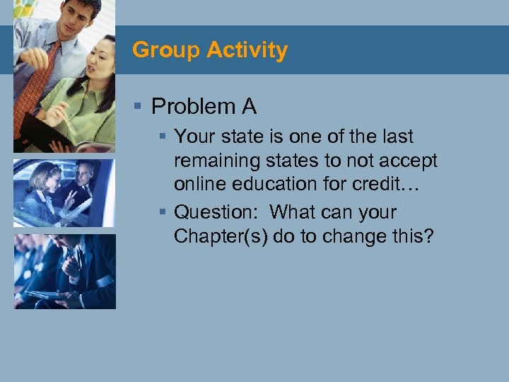 Group Activity § Problem A § Your state is one of the last remaining states to not accept online education for credit… § Question: What can your Chapter(s) do to change this?