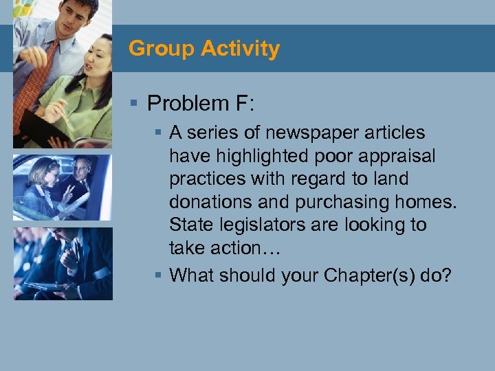 Group Activity § Problem F: § A series of newspaper articles have highlighted poor appraisal practices with regard to land donations and purchasing homes. State legislators are looking to take action… § What should your Chapter(s) do?