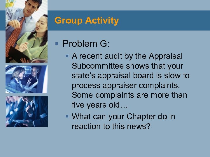 Group Activity § Problem G: § A recent audit by the Appraisal Subcommittee shows that your state’s appraisal board is slow to process appraiser complaints. Some complaints are more than five years old… § What can your Chapter do in reaction to this news?