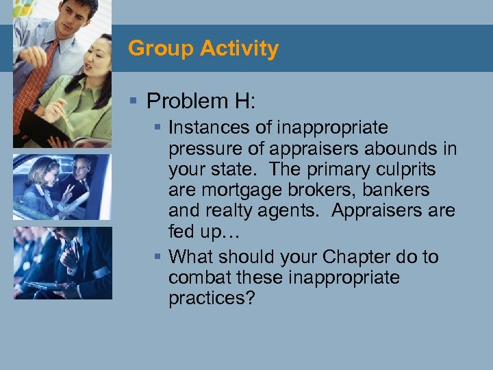 Group Activity § Problem H: § Instances of inappropriate pressure of appraisers abounds in your state. The primary culprits are mortgage brokers, bankers and realty agents. Appraisers are fed up… § What should your Chapter do to combat these inappropriate practices?