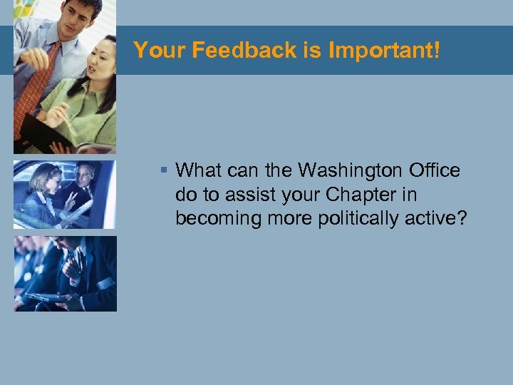 Your Feedback is Important! § What can the Washington Office do to assist your Chapter in becoming more politically active?