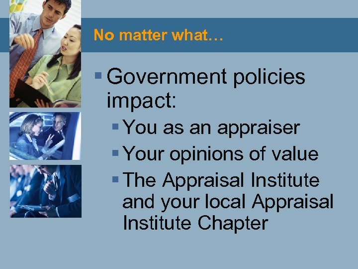 No matter what… § Government policies impact: § You as an appraiser § Your opinions of value § The Appraisal Institute and your local Appraisal Institute Chapter