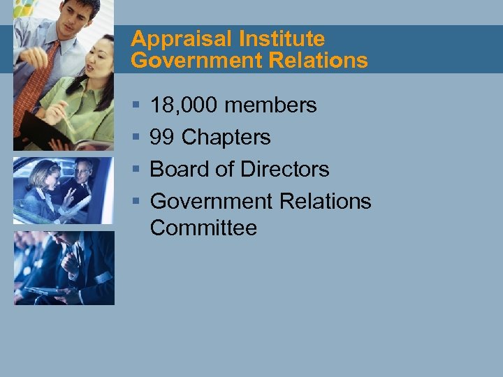 Appraisal Institute Government Relations § § 18, 000 members 99 Chapters Board of Directors Government Relations Committee