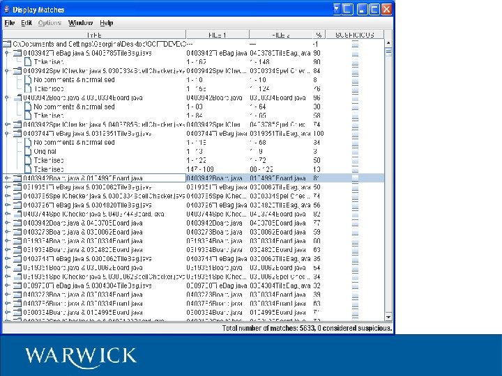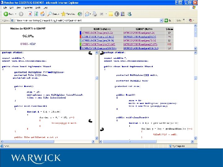 Code. Match – Algorithm 1) Remove comments, whitespace and lines containing only keywords/syntax; compare sequences of instructions 2) Extract comments, and compare 3) Extract identifiers, and count similar; x, xx 12345 are “similar” 4) Combine (1), (2) and (3) to give correlation score