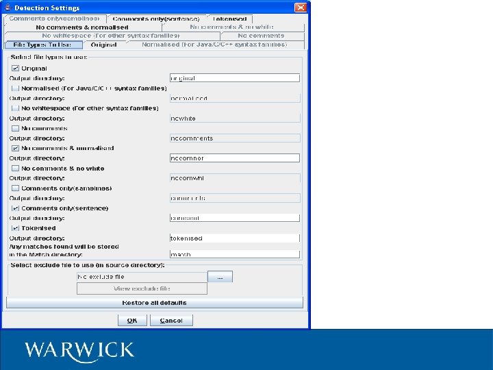 Detectors MOSS (Alex Aiken: Berkeley/Stanford, USA, 1994) JPlag (Guido Malpohl: Karlsruhe, Germany) – Java only – Programs must compile? Sherlock (Warwick, UK) (Joy and Luck, 1999)